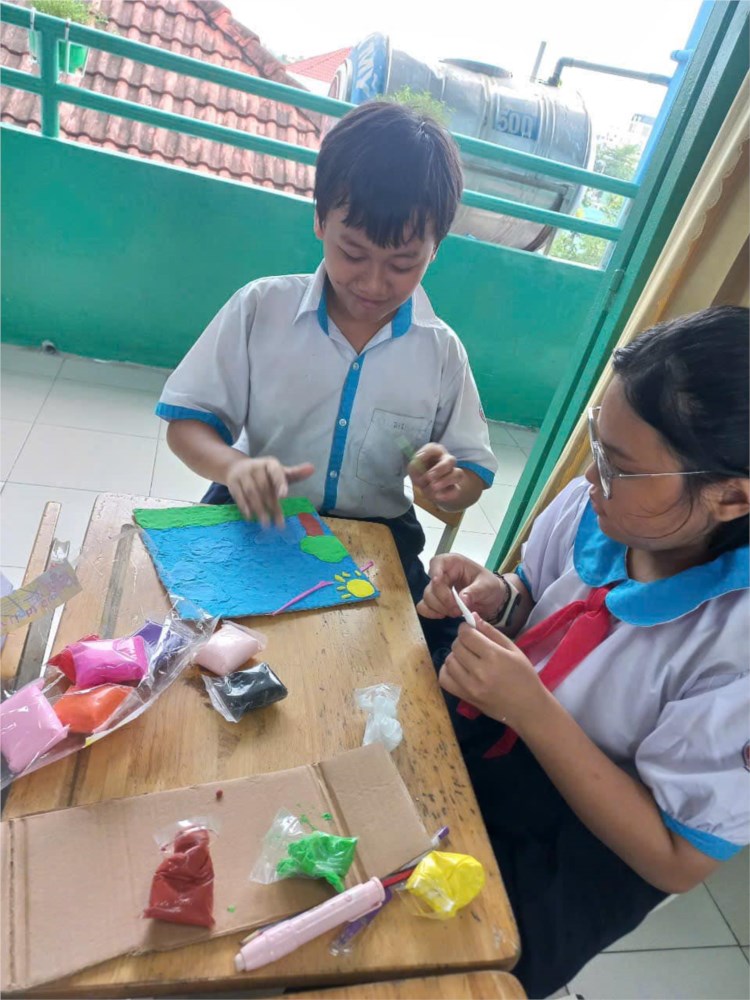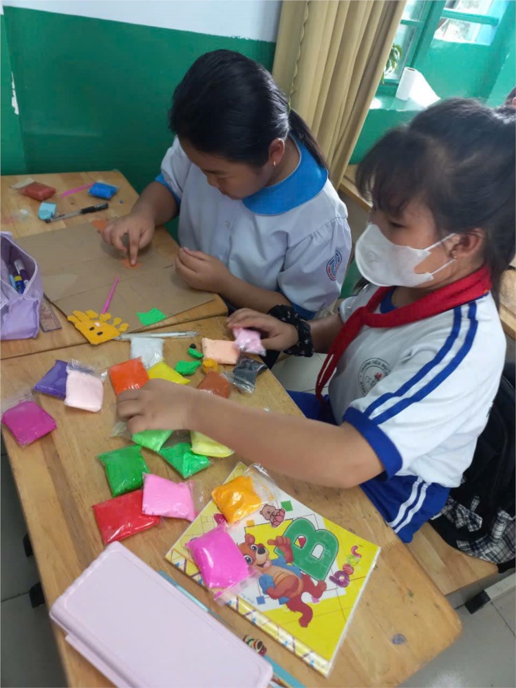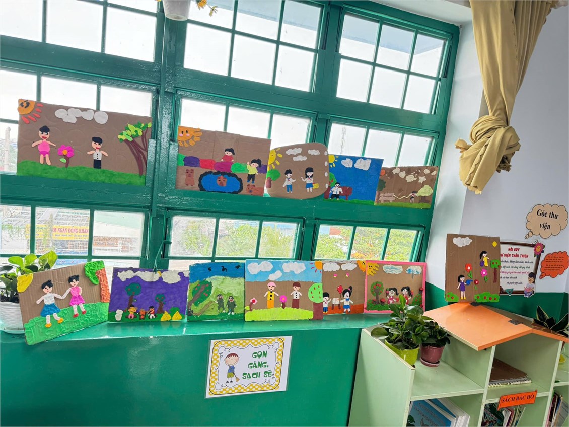 Các bạn đã đoàn kết và tạo ra những bức tranh thật thú vị. Hiện các sản phẩm đang được trưng bày tại góc thư viện của lớp. Đây cũng là một trong những nội dung mà Chi đội đưa ra để xây dựng “Chi đội 3 Tốt” trong năm học này.