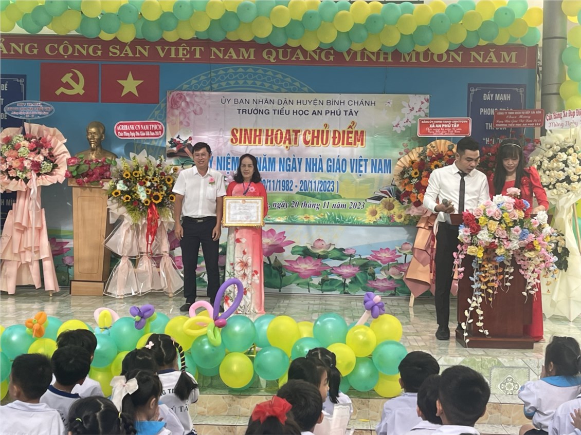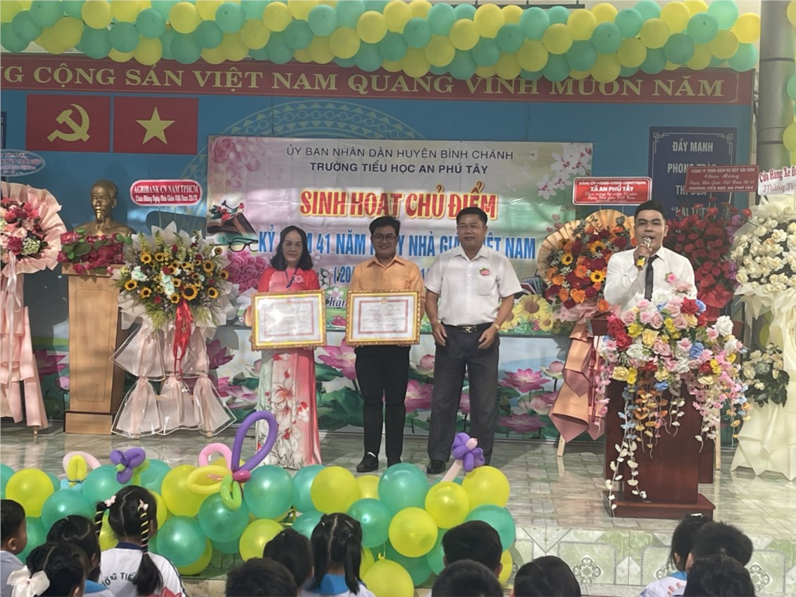 Tại hội trường sân cờ trường Tiểu học An Phú Tây đã diễn ra nhiều hoạt động; quí thầy/cô giáo, các bậc phụ huynh, các đại biểu địa phương, các em học sinh nô nức, hân hoan đón mừng ngày lễ.